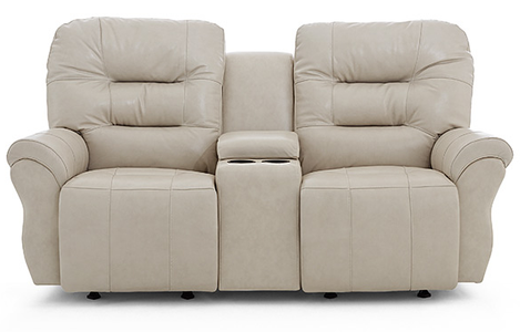 This reclining loveseat is available in the following options: Manual reclining Space Saver®, Power reclining Space Saver®, Manual reclining Space Saver® with center console, Manual reclining Rocker with center console, Power reclining Space Saver® with center console, Power reclining Rocker with center console.