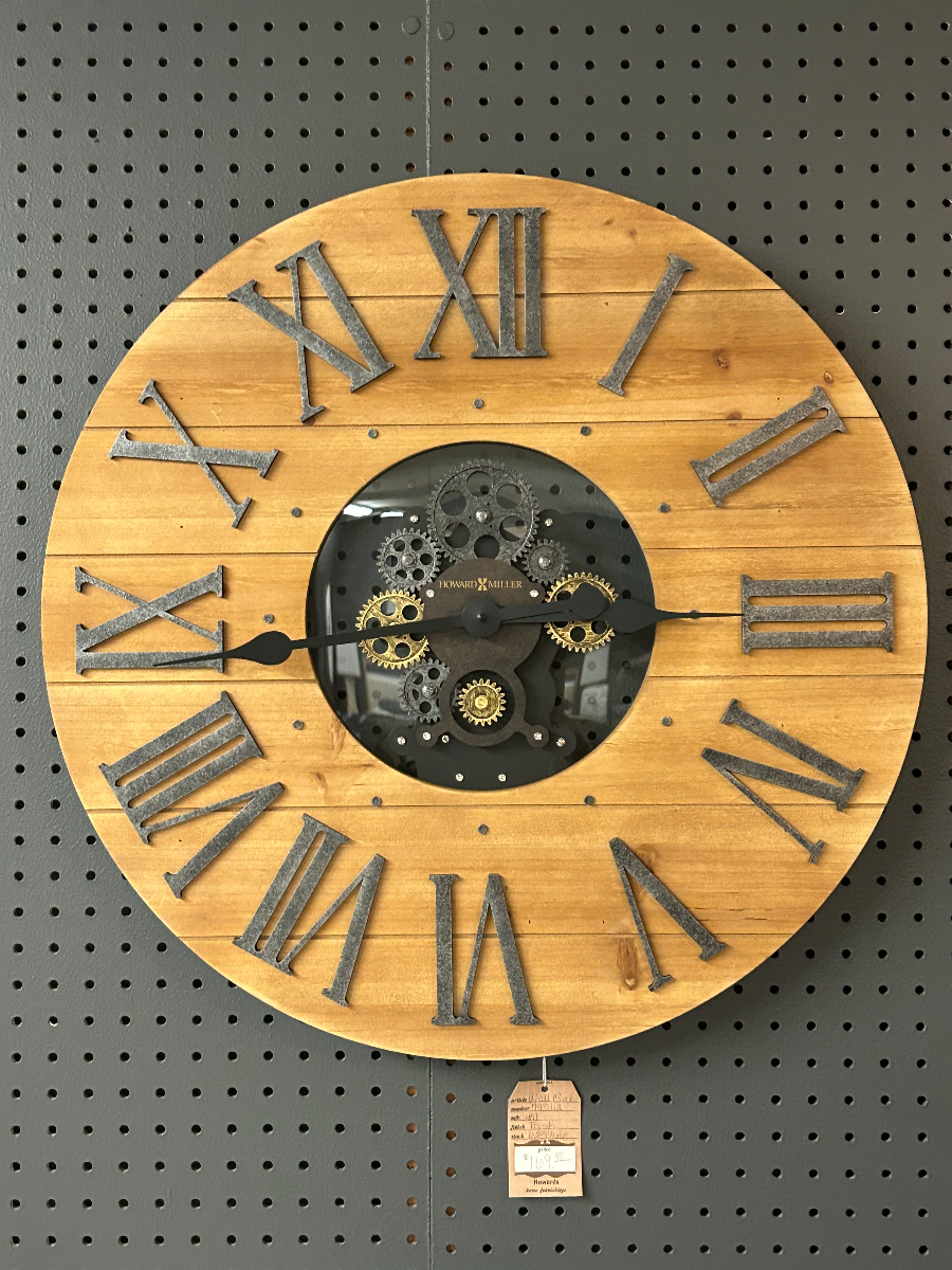 This oversized gallery wall clock's prominent features are the natural wood finish background, extra-large Roman numerals, and the unique arrangement of gears in the center of the clock that are suspended in a central opening. This clock is perfect for those hoping to add warmth to their space with a unique and highly versatile piece.Read More