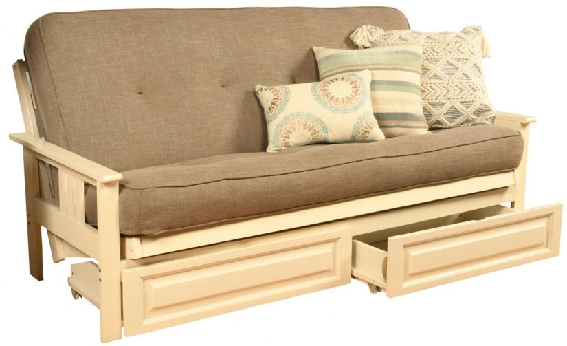 This futon frame has two optional drawers for out-of-sight storage