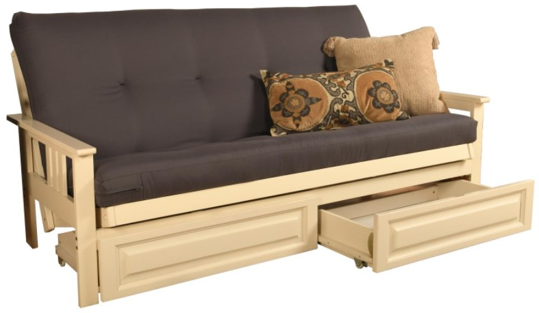 This futon frame has two optional drawers for out-of-sight storage