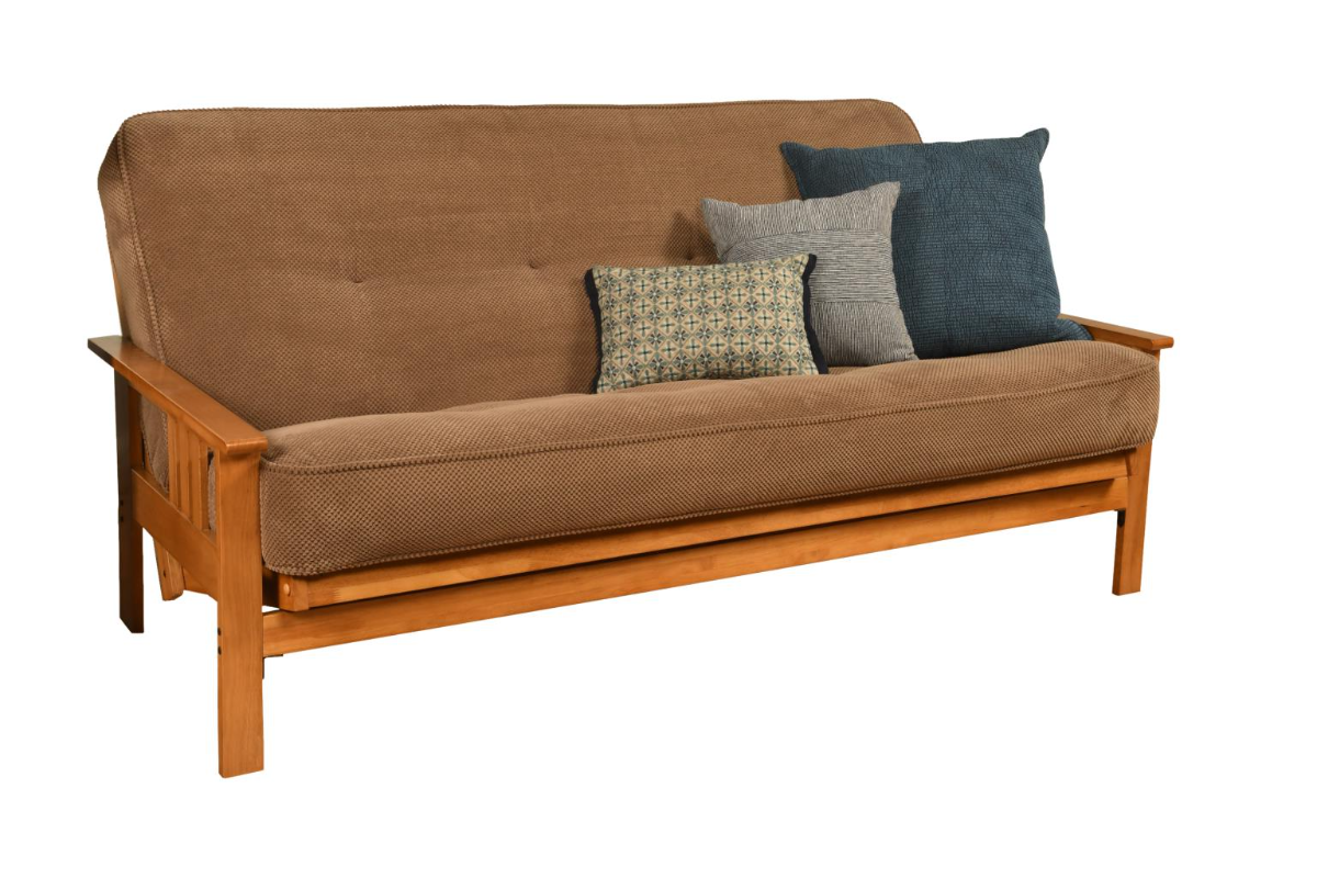 The mission style design on the arms of this solid wood futon frame cradle your mattress for sleeping comfort -- pillows and sheets stay put when using it as a bed. This easy-to-adjust frame comes in an array of colors and the comfort of sofa height seating, making this futon ideal for your bedroom, living room, or family room.Read More