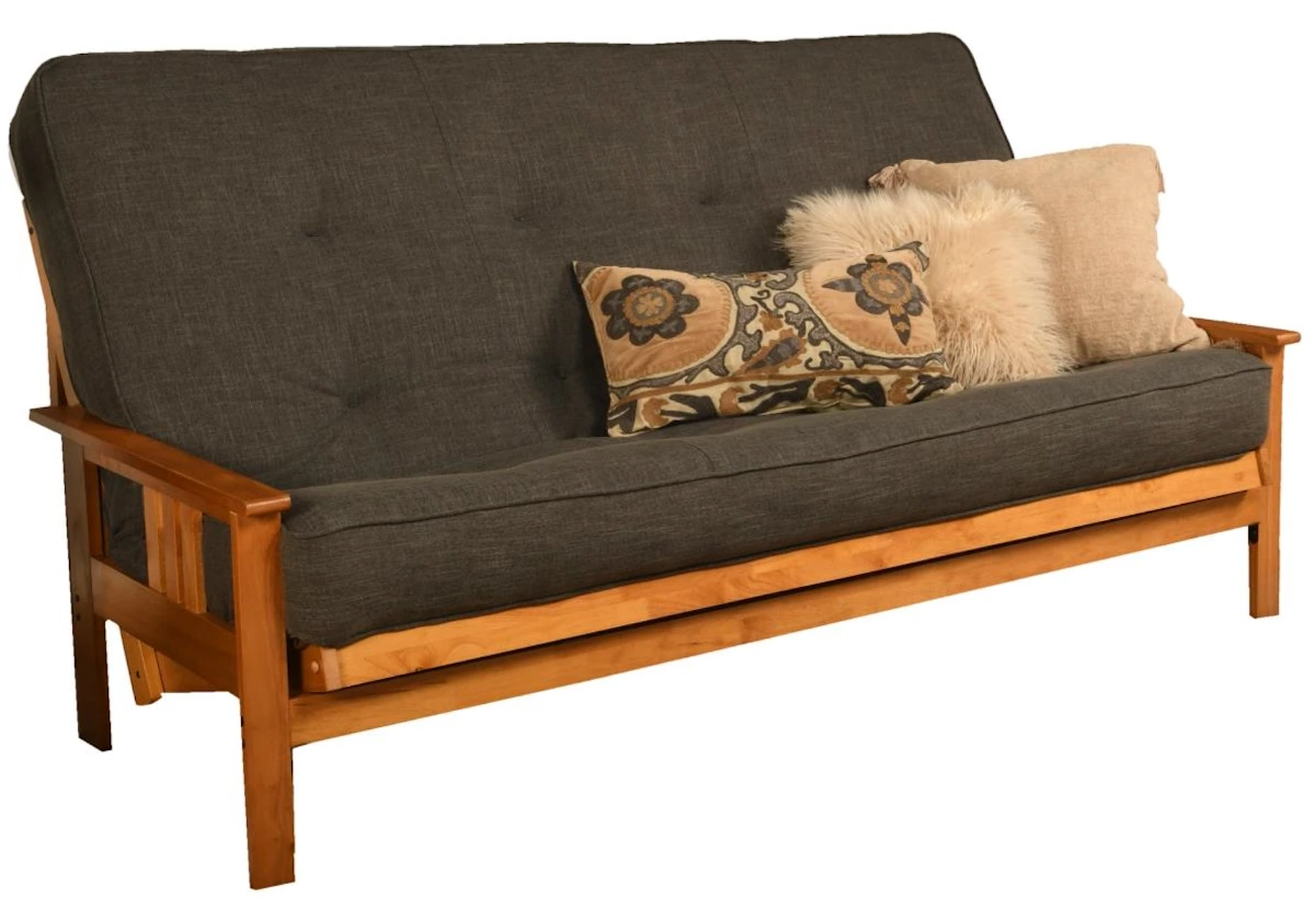 The Kodiak Furniture Monterey Butternut/Linen Charcoal Queen Futon with Mattress combines style and comfort, featuring a durable wooden frame and a plush mattress. Its elegant design enhances any space, making it perfect for living rooms or guest rooms. Versatile and functional, it easily converts from a sofa to a bed.Read More