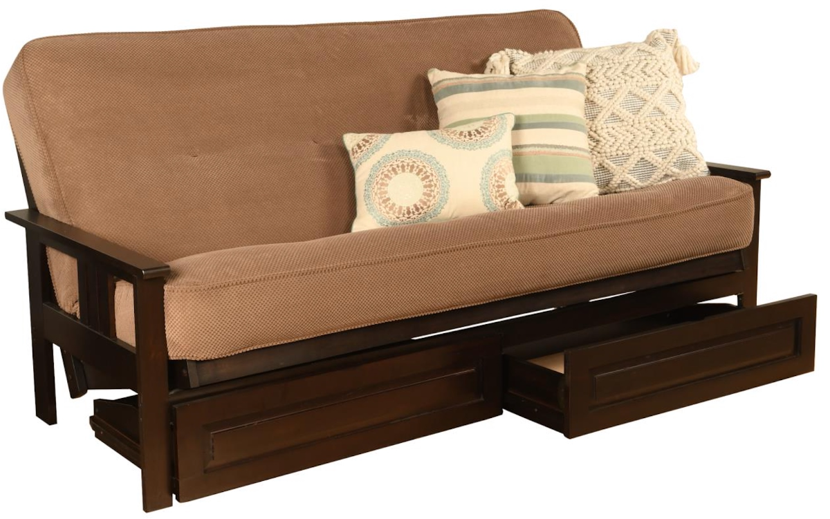 The mission style design on the arms of this solid wood futon frame cradle your mattress for sleeping comfort -- pillows and sheets stay put when using it as a bed. This easy-to-adjust frame comes in an array of colors and the comfort of sofa height seating.Read More