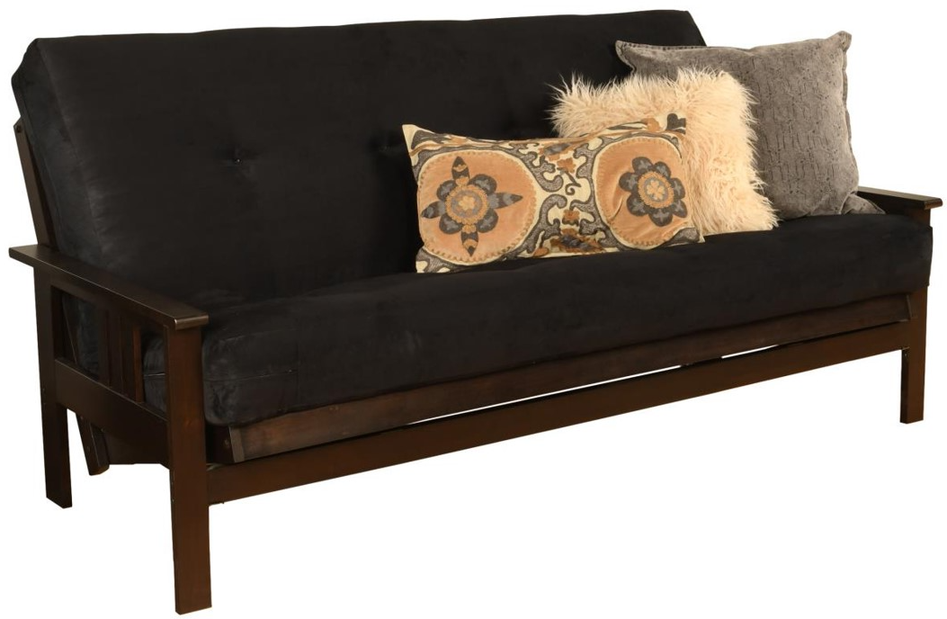 The mission style design on the arms of this solid wood futon frame cradle your mattress for sleeping comfort -- pillows and sheets stay put when using it as a bed. This easy-to-adjust frame comes in an array of colors and the comfort of sofa height seating.Read More