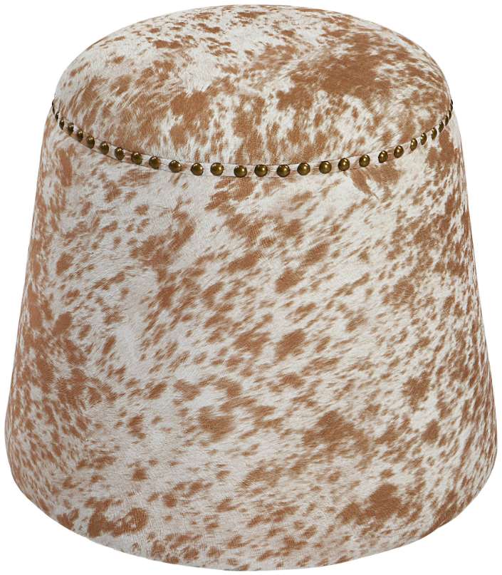 This plush ottoman is covered in a soft chestnut and white faux cow hide with antique brass nail head details. Versatile and stylish, this piece can be used as a seat or footrest, grouped together or as a singular accent piece.Read More