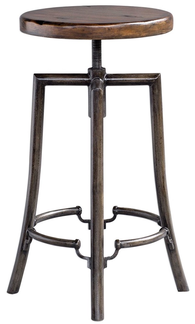 Featuring a natural Suar wood top finished in a lightly burnished dark walnut stain revealing warm honey undertones, set atop a refined industrial base crafted from hand forged iron and finished in an aged steel. Seat adjusts from 25" to 32" high.